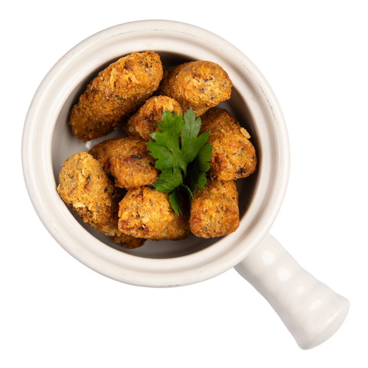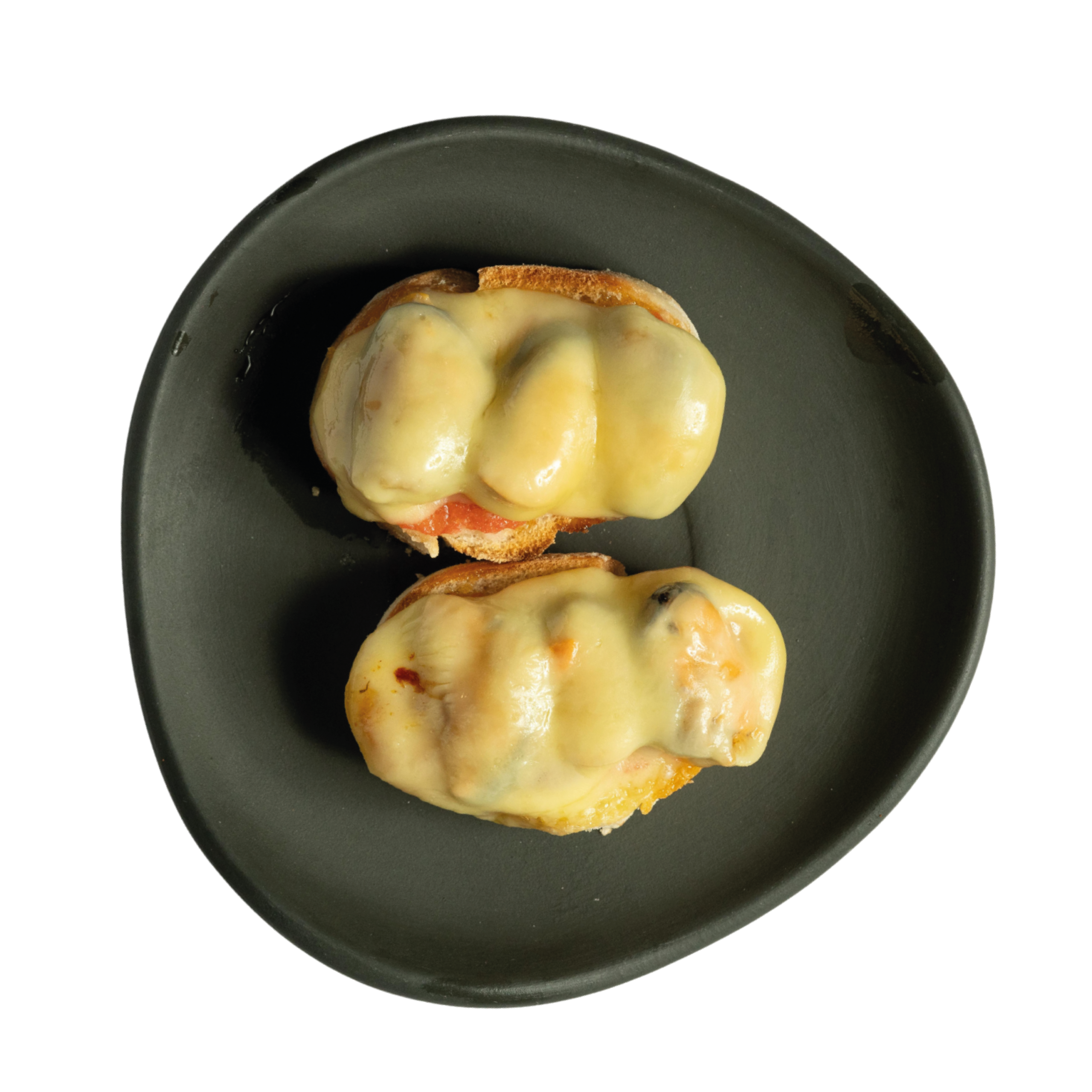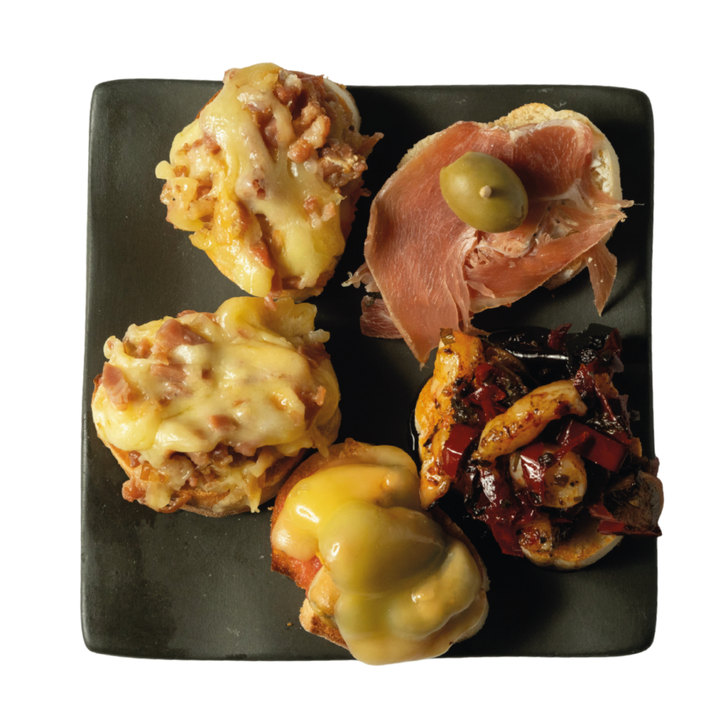 Tapa Ramona, Serrano ham and cream cheese, mussels au gratin with Gouda cheese and garlic shrimp