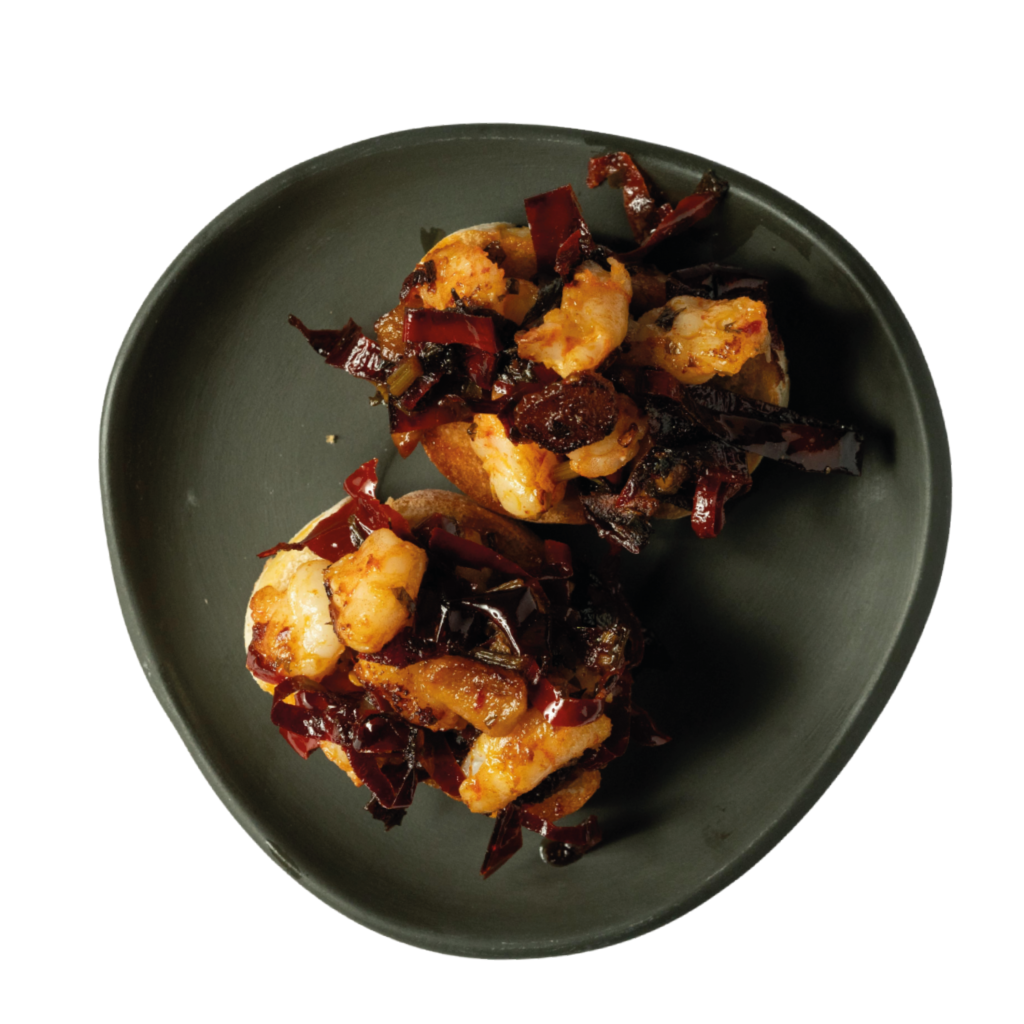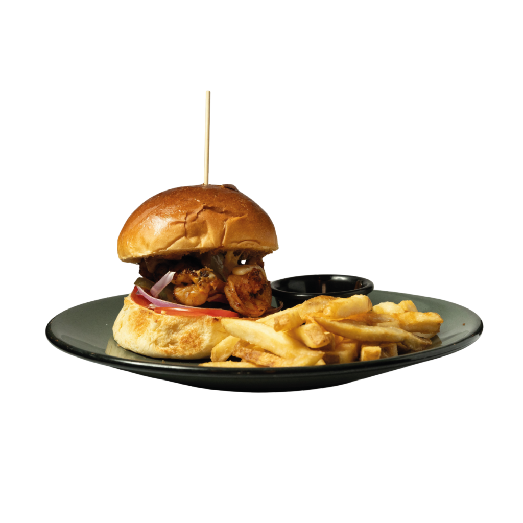 Shrimp, mozzarella, homemade brioche bread with french fries.