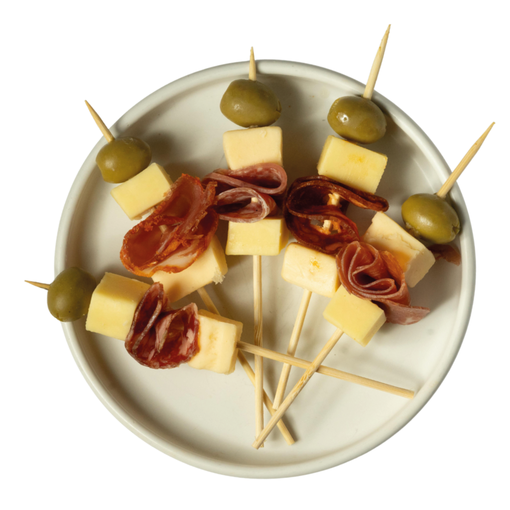 Small skewers of mozzarella cheese, gouda cheese, olives, salami, serrano ham, cured pork loin, Iberian sausage and Iberian chorizo