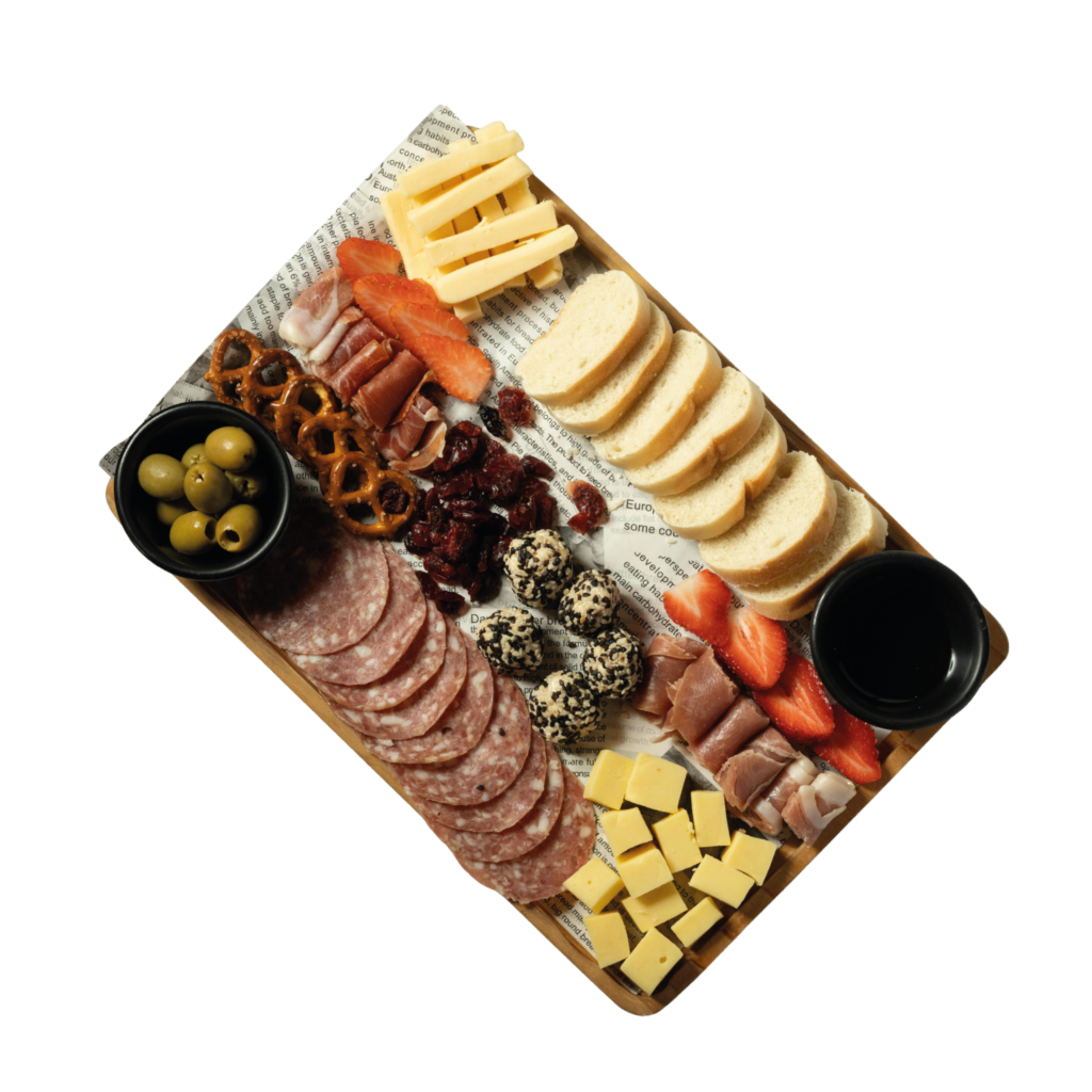 Mozzarella cheese, Philadelphia cheese, Gouda cheese, Serrano ham, green olives, strawberries, dried cranberries, honey, salami and prosciutto.